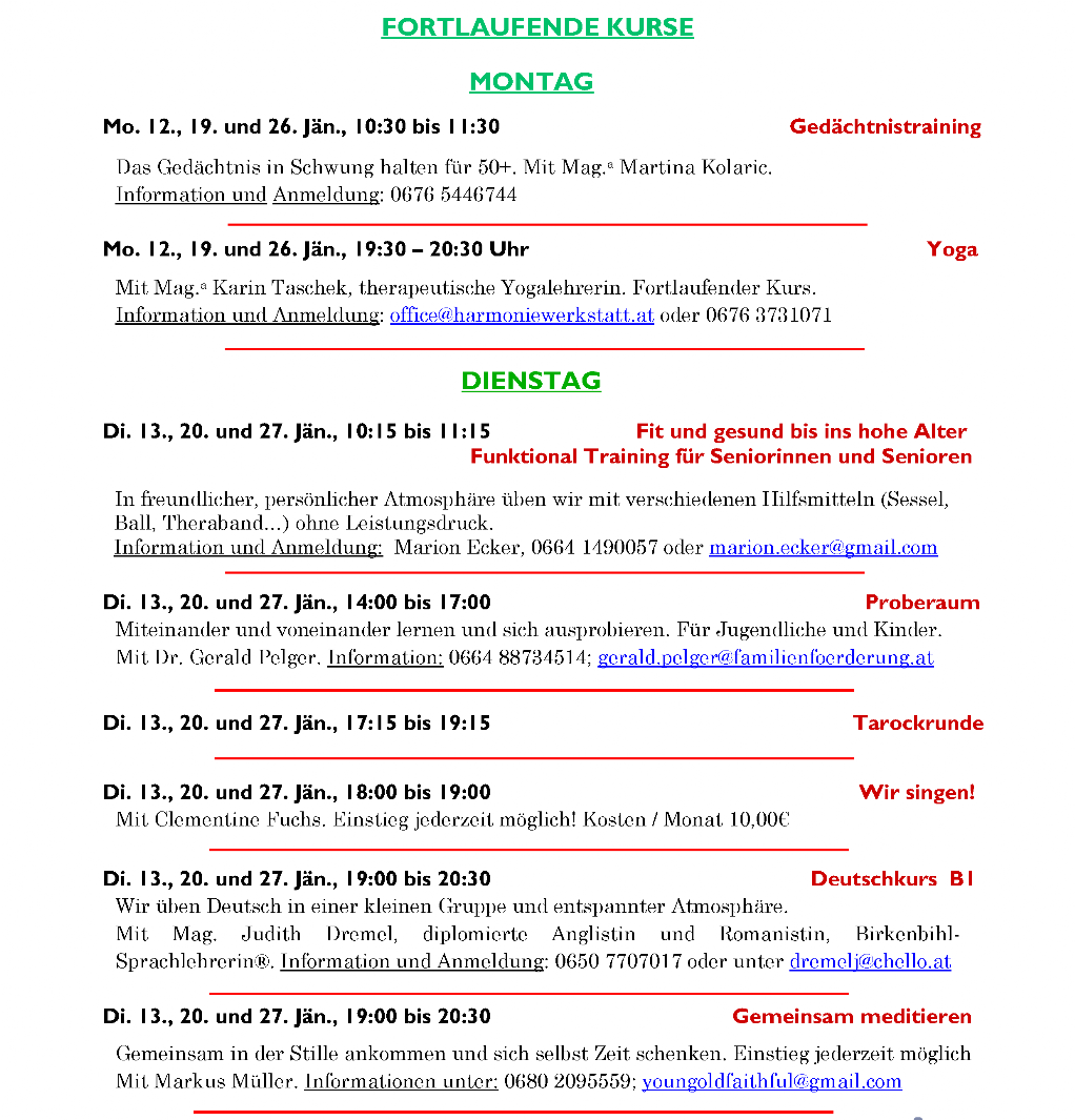 Das feststehende Wochenprogramm bleibt vom wechselnden Monatsprogramm unberührt aufrecht.